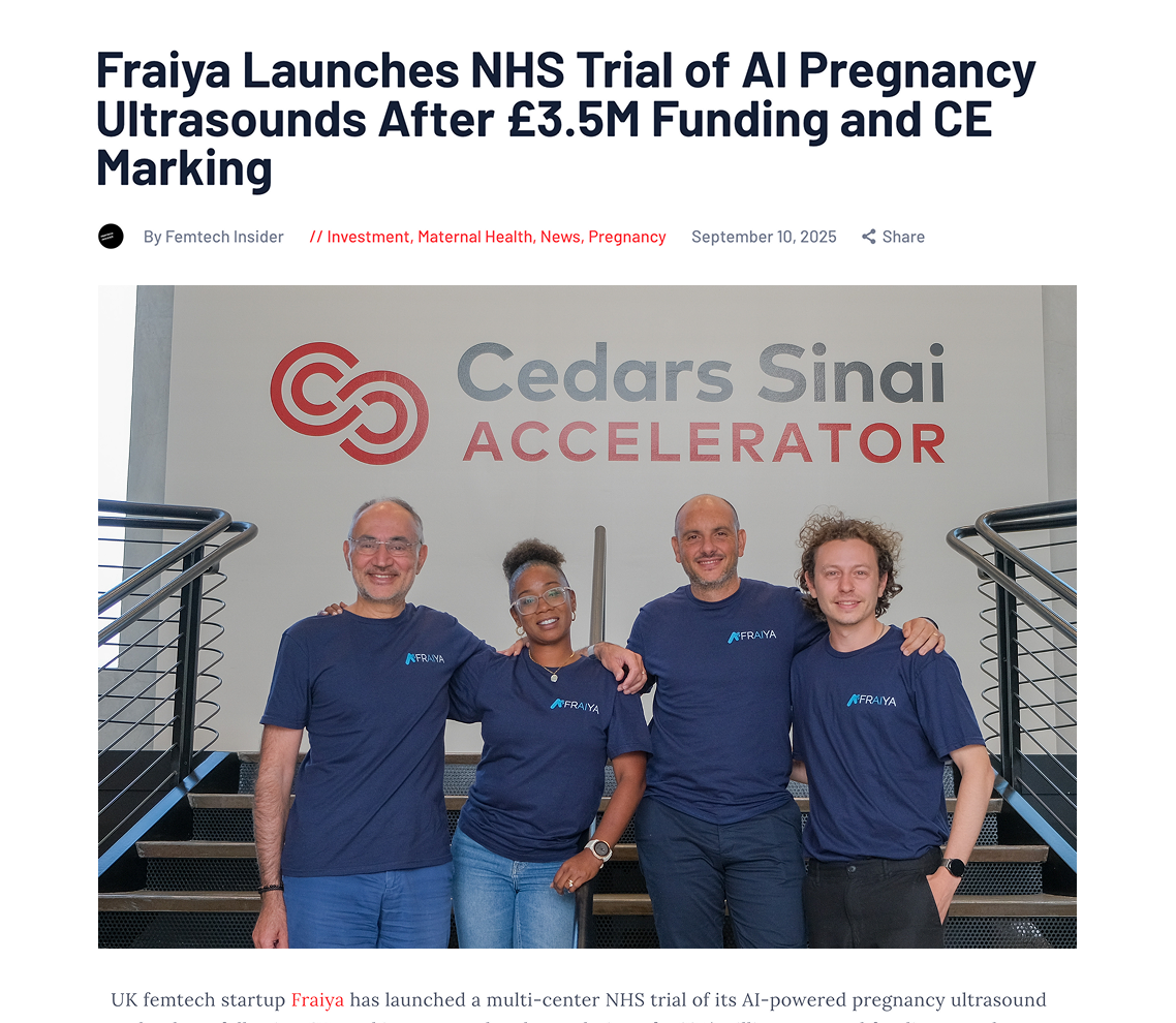 Nearly half of serious congenital conditions are not detected before birth. This leaves families without answers and clinicians managing uncertainty under pressure. Fraiya builds on over a decade of research from King’s College London and Guy’s and St Thomas’ Hospital. Across three completed clinical studies involving 47,000+ patients, this work demonstrated how AI can safely support fetal ultrasound in real clinical settings. Fraiya Ltd was incorporated in 2024 to translate that evidence into practice, responsibly, and at pace.